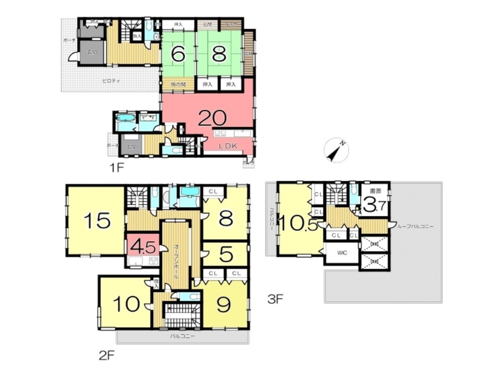 - トイレ5ヶ所、キッチン2ヶ所、バスルーム2ヶ所、玄関2ヶ所、納戸2ヶ所、書斎、ルーフバルコニー