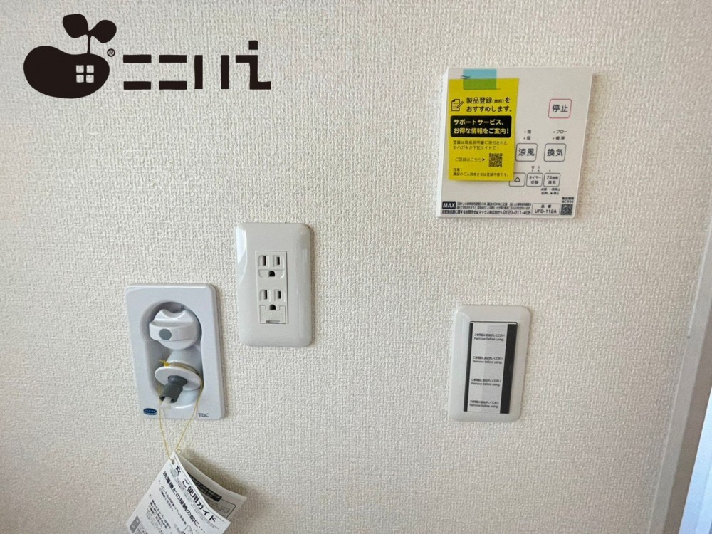 - カウンターキッチン、IHクッキングヒーター、オール電化、シャンプードレッサー、浴室乾燥機、複層ガラス、ウォークインクローゼット、モニタ付インターホン、駐車場2台分、床下収納、エコキュート、トイレ2箇所、ダウンライト、人感センサー、散水栓、白アリ防虫済、地盤保証、ベタ基礎、外壁サイディング仕様、シャッター、親水コート、10年保証