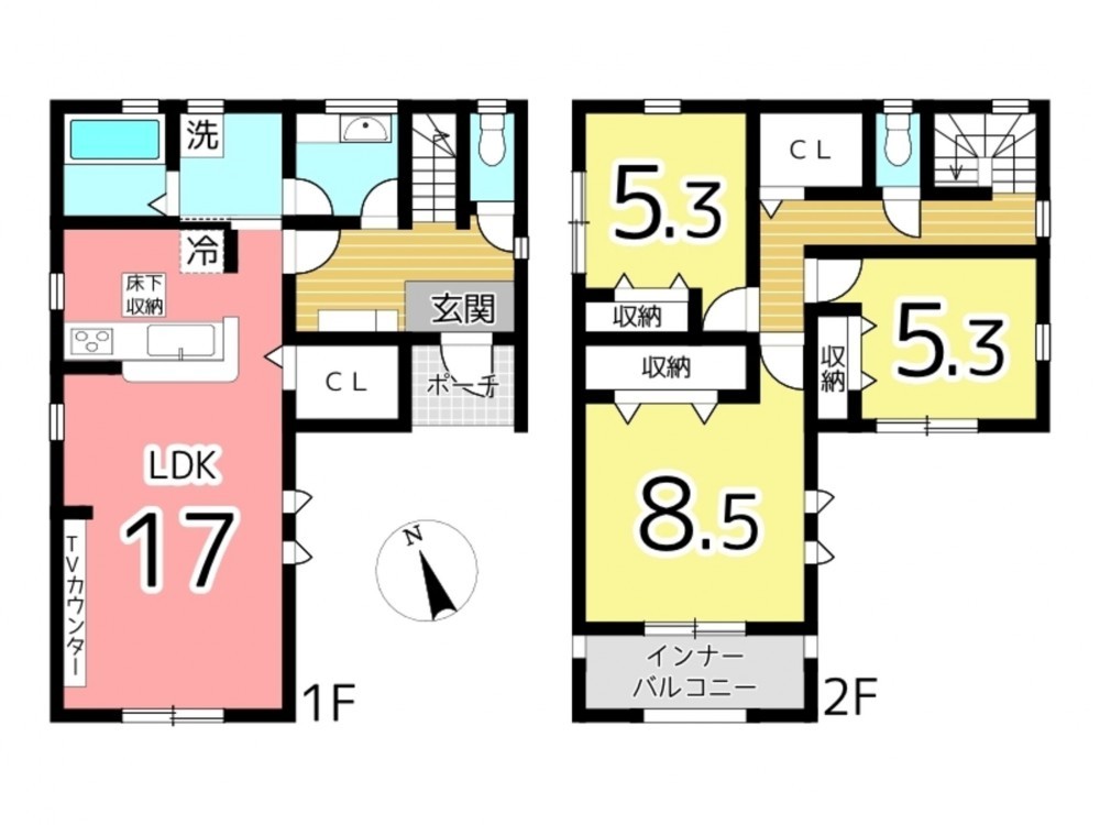 - カウンターキッチン、シャンプードレッサー、浴室乾燥機、モニタ付インターホン、洗浄便座、駐車場2台分、床下収納、トイレ2箇所、人感センサー、基礎パッキン工法、玄関収納、浄水器付きキッチン